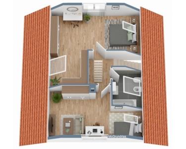 Im Dachgeschoss stehen zwei großzügige Schlafzimmer zur Verfügung, die sich flexibel nutzen lassen und viel Platz für individuelle Wohnideen bieten. Ein weiteres Tageslichtbad mit Badewanne komplettiert diese Ebene und macht das Haus besonders familienfreundlich.