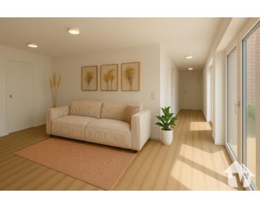 Vom Eingangsbereich gelangen Sie in den langen Flur mit direktem Anschluss zum modernen Badezimmer offenen Wohn- und Essbereich mit integrierter Küche. Von dort aus haben Sie direkten Zugang zur Terrasse, auf der Sie die Abendsonne genießen können.