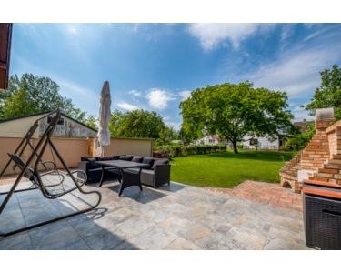 Die 28 m² große Terrasse mit Grillplatz bietet den perfekten Rahmen für Familienfeiern und gemeinsame Grillabende.