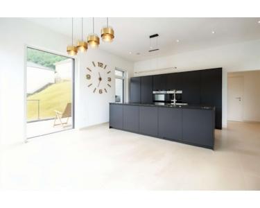 Über die Treppe im Flur gelangen Sie in das Untergeschoss. Dort öffnet sich ein weitläufiger, offen gestalteter Wohn-, Ess- und Küchenbereich, der durch große Fensterfronten viel Tageslicht erhält und einen wunderschönen Blick ins Grüne bietet.
