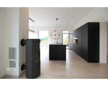 Die hochwertige Küche ist vollständig in den Raum integriert und bildet gemeinsam mit dem Ess- und Wohnbereich einen großzügigen Raum, der zum Mittelpunkt des Hauses wird. Der Essbereich schließt direkt an die Küche an, während der Wohnbereich mit seinem modernen Kaminofen angrenzt und eine gemütliche Atmosphäre schafft.