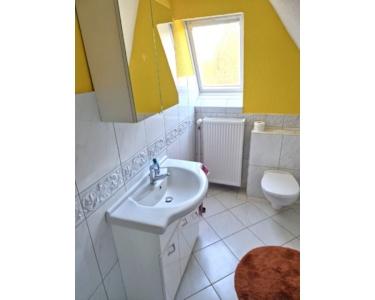 Über den überdachten Eingangsbereich gelangt man in den separaten Vorflur, neben dem sich zur Rechten der Hausanschlussraum und zur Linken das helle Bad befindet.