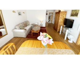 Ab dem 01.12.25 wird die voll möblierte Wohnung wieder frei. Die Wohnung wurde hochwertig mit Naturmaterialien saniert und verfügt über einen geölten Parkettboden. Sie umfasst einen Wohn-Essbereich, einen offenen Flur, ein Tageslicht-Bad mit Whirlpool-Badewanne und Dusche mit Massagefunktion, einen Schlafbereich mit einem 160 cm breiten Doppelbett, und eine voll ausgestattete Küche (Spülmaschine, Kühlschrank mit Gefrierfach, Mikrowelle, Herd, Kaffeemaschine, Wasserkocher, Geschirrtücher, Töpfe, Teller, Besteck). Ein Dachbalkon lädt zum Verweilen ein. Das Bad ist zudem mit einer Waschmaschine und einem Trockner ausgestattet. Ein Fernseher steht zur Verfügung. Weitere Ausstattungen sind eine Klimaanlage, ein Bügeleisen, ein Bügelbrett und ein Schlafsofa im Wohnzimmer. Handtücher, Bettwäsche und Geschirrtücher sind ebenfalls vorhanden.