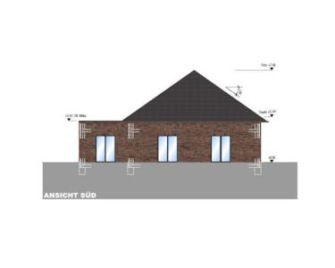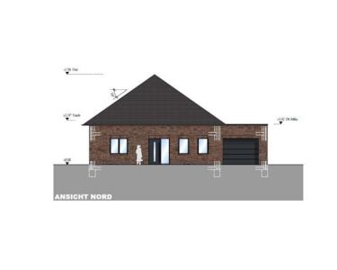 Der Walmdachbungalow wird auf einem Lückengrundstück schlüsselfertig erstellt.