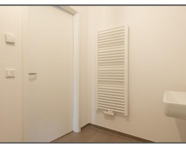 Das hochwertig ausgestattete Badezimmer verfügt über eine Duschwanne, ein WC, ein Waschbecken und eine Handtuchheizung. Dank des kleinen Fensters können Sie den Raum jederzeit gut belüften.