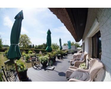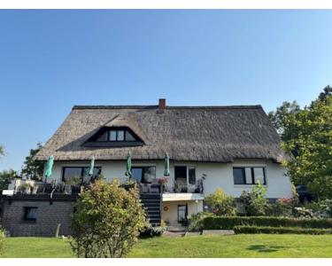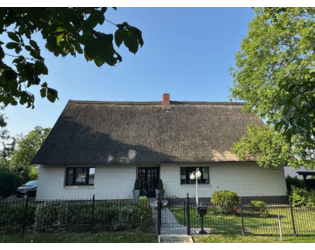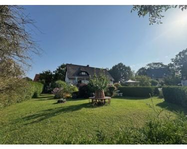 Das reetgedeckte Einfamilienhaus mit seinem weißen, rustikalen Klinker steht auf einem sonnigen Grundstück direkt am Feldrand.