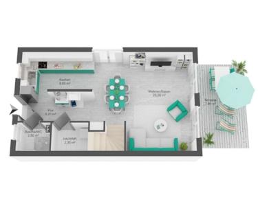 Im Erdgeschoss erwartet Sie ein offener Wohn- und Essbereich mit Zugang zur Terrasse und Garten, eine offene Küche mit Einbauküche, ein Gäste-WC mit Dusche und ein Hauswirtschaftsraum. Das erste Obergeschoss bietet zwei flexibel nutzbare Zimmer, ein großzügiges Schlafzimmer und ein stilvolles Tageslichtbad. Das Dachgeschoss überzeugt mit einem lichtdurchfluteten Studio, ideal als Arbeits- oder Gästezimmer.