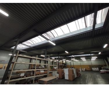 Der Innenraum ist als weißer Hintergrund gestaltet. Alle Versorgungsleitungen, die Beleuchtung und die Hallenheizung liegen sichtbar in einer Ebene.
