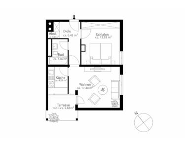 Beim Betreten empfängt Sie eine großzügige Diele, die Zugang zu allen Räumlichkeiten bietet und ausreichend Platz für eine Garderobe oder zusätzliche Staumöglichkeiten bereithält. Rechter Hand befindet sich das innenliegende Badezimmer, ausgestattet mit einer Duschwanne. Ebenfalls von der Diele aus erreichen Sie das geräumige Schlafzimmer, das mit seiner angenehmen Größe vielfältige Einrichtungsmöglichkeiten bietet.