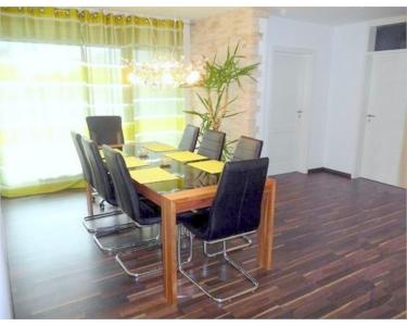 Im Eingangsbereich befinden sich, nebst einer großen Garderobe, die Zugänge zu Küche und Gäste-WC. Gleich im Anschluss kommen Sie in den lichtdurchfluteten Essbereich. Eine Steinverkleidung an der Wand sorgt für besonderes Wohlfühlambiente. Das Schlafzimmer verfügt über einen geräumigen begehbaren Schrank. Eine weitere Besonderheit ist die über 200 m² große, nach Süden ausgerichtete Sonnenterrasse. Durch Ihre L-Form kann man sie von nahezu allen Wohnräumen begehen.