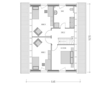 Das klassische Satteldachhaus ist allen anderen Bauformen zum Trotz immer noch der Favorit auf der Beliebtheitsskala der Hausbauer. Dieses Haus bietet einer jungen Familie 4 Zimmer, Küche, Bad, Gäste-WC, Diele und Hauswirtschaftsraum auf einem überaus funktionalen Grundriss angeordnet.