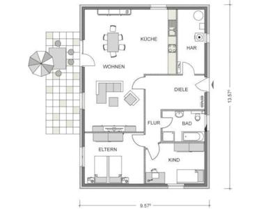 Ein großer Wohn- und Essbereich mit offener Küche lädt in diesem Bungalow zum Entspannen und Wohlfühlen ein. Drei Zimmer, Küche, Bad, Diele, Flur und Hauswirtschaftsraum finden auf ca. 110 qm Platz und bieten Wohnraum für Familien mit einem Kind.