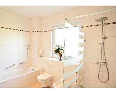 - Gefliest sind die Bäder und Duschbäder die Fußböden der Bäder, die senkrechten Wände im Bad werden in einer Höhe bis ca. 2,00 m verfliest.