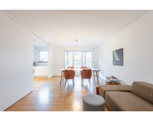 Die Wohnung bietet einen gut durchdachten Grundriss: Das Wohnzimmer geht direkt in die Küche über, wobei eine Schiebetür die beiden Räume bei Bedarf voneinander trennt. Die Küche ist mit allen nötigen Geräten ausgestattet.