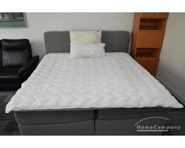 Wohn/Schlafzimmer mit Sofagarnitur, Couchtisch, Schreibtisch mit Stuhl, Kommode, Kein TV, Boxspring-Bett 180 x 200 cm.
