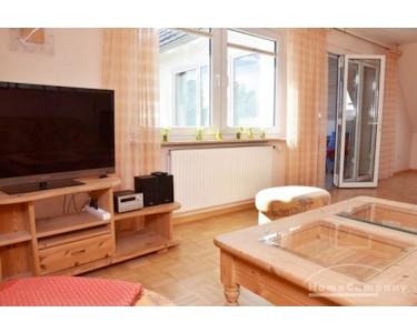 Wohnzimmer mit Ecksofa, Couchtisch, Internet-TV, Wohnzimmerschrank, Esstisch mit 4 Stühlen.
