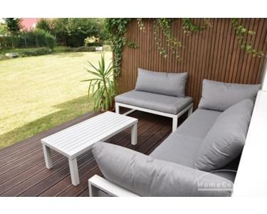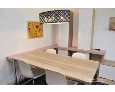 Wohnzimmer mit Sofa, Couchtisch, Esstisch mit 4 Stühlen, Schreibtisch mit Stuhl, Lowboard mit Kabel-TV, Laminat, Zugang zur