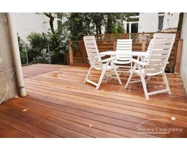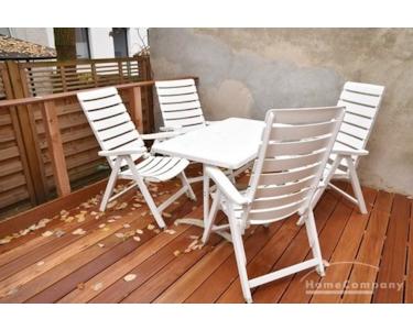 Holzterrasse mit Gartenmöbeln. Zugang auch vom Schlafzimmer.