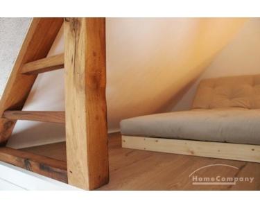 Großzügiger Wohn-Essbereich, der Fernseher kann für WLAN genutzt werden, von hier kleine Leiter zum ausgebauten Schlafboden mit Futonbett 140 x 200 cm.