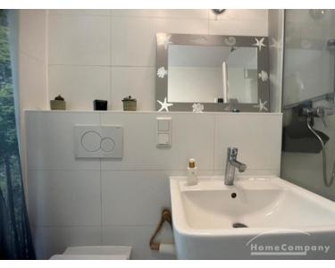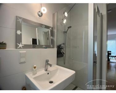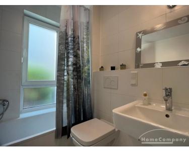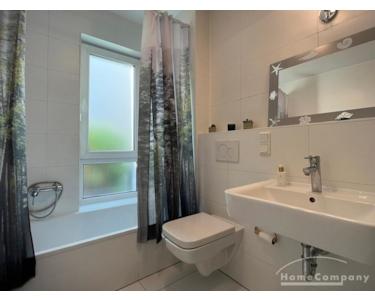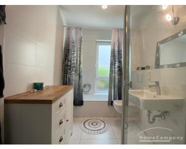 Das moderne Badezimmer ist mit Dusche und Badewanne ausgestattet. Badezimmermöbel sind bereits vorhanden.