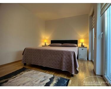 Im großzügigen Schlafzimmer befindet sich ein komfortables Kingsize-Springbett. Zwei Nachttische sowie ein geräumiger Kleiderschrank mit Spiegelfront bieten viel Stauraum. Bodentiefe Türen eröffnen den Blick ins Grüne.
