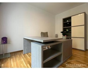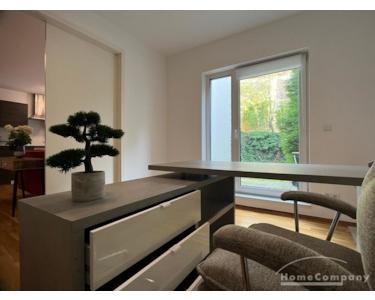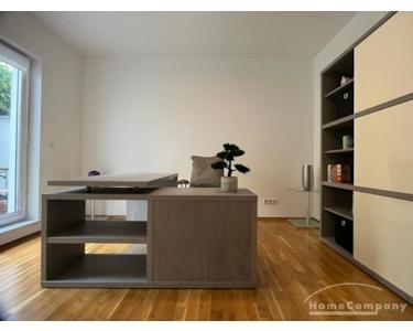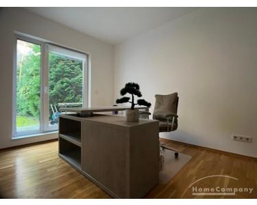 Ein separater, heller Arbeitsbereich mit durchdachter Homeoffice-Möblierung sorgt für ein ruhiges und konzentriertes Arbeiten – ebenfalls mit Blick auf den Garten und die zweite Terrasse.