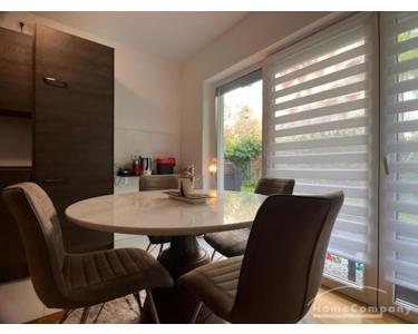 Der großzügige Wohn- und Essbereich bietet viel Platz zum Wohlfühlen. Ein gemütliches Wohnzimmer mit großem Schlafsofa und TV lädt zur Entspannung mit Blick in den Garten und auf die Terrasse ein. Das angrenzende Esszimmer ist hochwertig mit Eichenholz und weißem Steinmarmor ausgestattet.