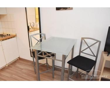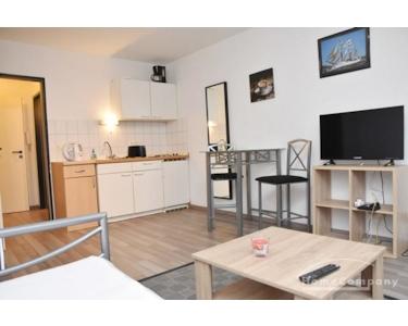 Wohn/Schlafraum mit Bett 1 m, Nachttisch,kleine Couch mit Couchtisch, Hocker, TV, Kleiderschrank, Tisch mit 2 Hockern, Laminat.