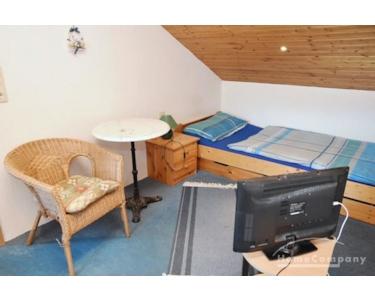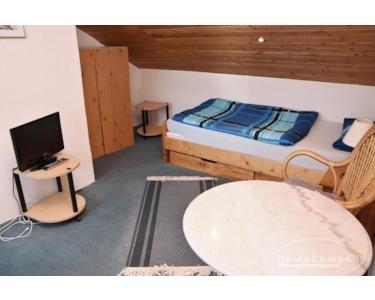 2. Schlafzimmer 10 qm mit Bett 1 m, Nachttisch, Schrank, Tisch, Stuhl, Fernseher, Duschbad.