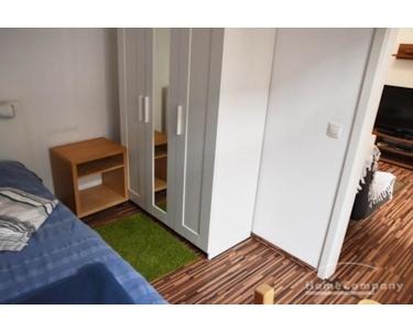 Arbeits/Schlafzimmer mit Einzelbett 100x200 cm und Tisch/Schreibtisch, Kleiderschrank, Laminat.