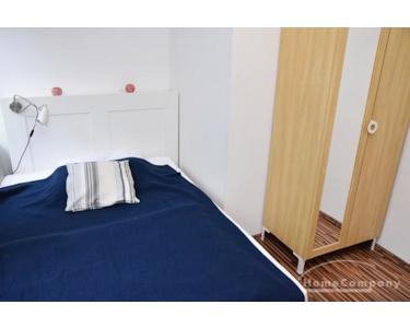 Schlafzimmer mit Bett 140 cm, Kleiderschrank, Laminatfußboden.
