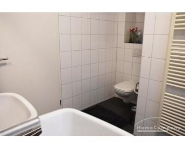 Wannenbad/WC, Fliesenboden, Waschmaschine.