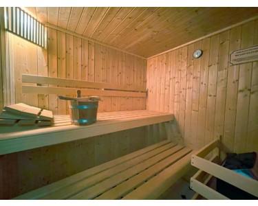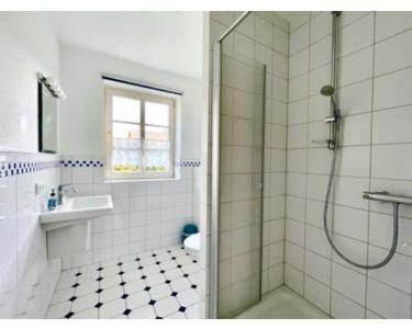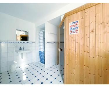 Das Haus besitzt zwei Tageslicht-Bäder, jeweils mit Dusche, Handtuchwärmer, WC und Waschbecken mit Halbsäule. Ein Bad verfügt zusätzlich über eine eingebaute Sauna (Hersteller: Helo Knüllwald) und Saunaschlauch in der Dusche. Direkter Zugang vom Saunaraum zum Garten durch eine friesische "Klöntür".