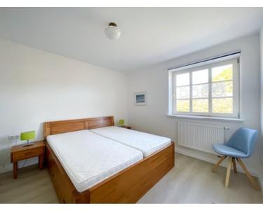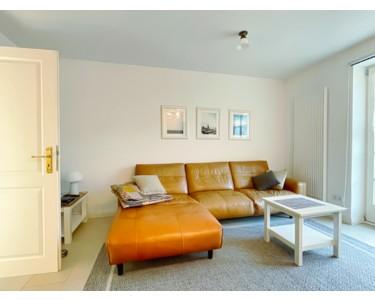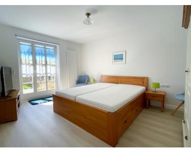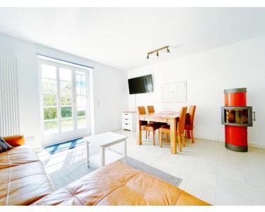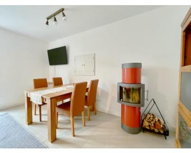 Die Immobilie verfügt über zwei geräumige Schlafzimmer, davon eins mit TV und Zugang zur Terrasse. Auch das große Wohnzimmer besitzt einen Zugang zur Sonnenterrasse. Es hat einen großzügigen Essbereich und einen Designer-Kachelofen (Manufaktur Hase/Trier).