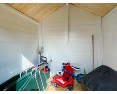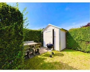 Ein vom Tischler gefertigtes Gartenhaus bietet Platz für Outdoor-Möbel, Gartengeräte und Grill.