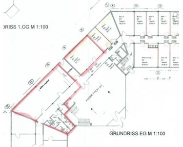 Die Raumzuordnung könnte sein EG links 150 m² und Pausenraum Mitte 50 m² und oder im OG I 322 m² mit separater Raumaufteilung, also insgesamt 522 m² teilbar in 200 m² und 322 m².