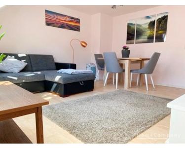 Wohnzimmer mit Funktionssofa, Couchtisch, Esstisch mit 3 Stühlen, Lowboard mit Smart-TV.