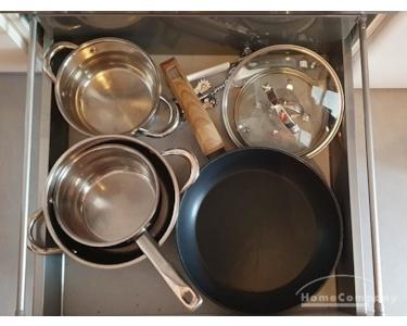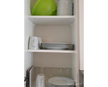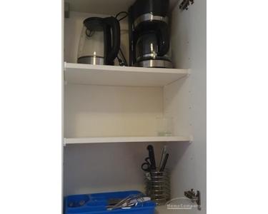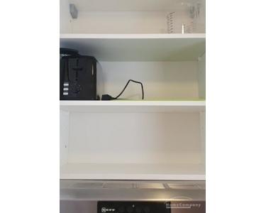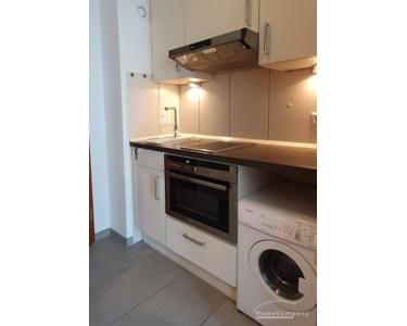 Offene Küchenzeile im Eingangsbereich, komplett ausgestattet mit kleiner Waschmaschine.