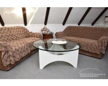 Wohnraum mit 2 großen Dachfenstern, Couchtisch, 2 Sofas, Sessel, Einbaukleiderschrank, Schreibtisch mit Stuhl, 2 Kommoden.