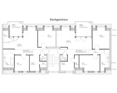 Das Angebot bezieht sich auf die Wohnung 16 im 3. Obergeschoß = Dachgeschoß des Hauses 11. Die Wohnung ist ein vollständiger Neubau. Sie besteht aus dem attraktiven Wohnraum mit Zugang zur teilweisen überdachten Loggia. Gegenüber des Wohnraumes ist die Küche mit Abstellraum angeordnet. Von der zentralen Diele erreichen Sie das geräumige Elternschlafzimmer, das schönen Kinderzimmer/Büro, das moderne Duschbad mit Fenster, das Gäste-WC sowie den Abstellraum.