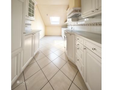 Die angrenzende Küche ist mit einer hochwertigen Einbauküche ausgestattet, die keine Wünsche offenlässt. Die hellen Fliesen und die durchdachte Anordnung der Küchenelemente sorgen für ein angenehmes Arbeitsumfeld.