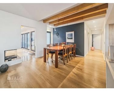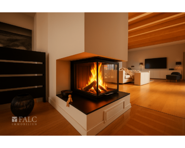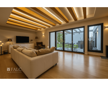 Bereits beim Betreten wird die besondere Atmosphäre spürbar. Das luxuriöse Wohnzimmer beeindruckt mit einer einzigartigen Deckenbeleuchtung zwischen architektonisch integrierten Holzbalken, die dem Raum Wärme und Exklusivität verleihen. Der stilvolle Kamin sorgt für gemütliche Stunden. Große Fensterflächen, eine integrierte Sitzbank am Fenster und der direkte Blick ins Grüne bzw. auf das Wasser schaffen ein unvergleichliches Wohngefühl.
