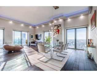Beim Betreten der Wohnung im 22. Stock gelangt man in den zentralen Flur, welcher sowohl zwei (ev. auch drei) Schlafzimmer, Gästebad, Masterbad en Suite, Ankleideraum als auch den loftartigen luxuriösen und großzügigen Wohn- und Essbereich mit Kaminzimmer und die Küche erschließt.