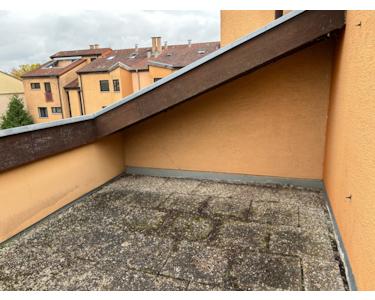 Die Dachterrasse ist mit Betonplatten ausgelegt.