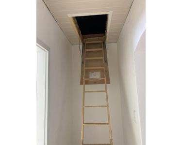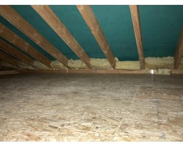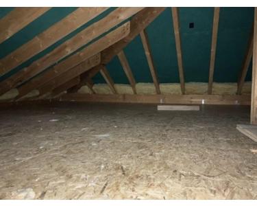 -Der Dachboden wurde 2022 auf ca. 30 m² mit Holzspanplatten verkleidet, um diesen als Lager für Kleidung, Dekoration etc. zu nutzen.