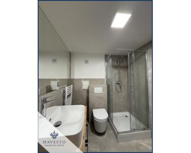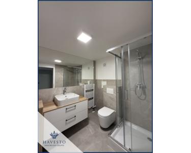 Das Badezimmer wurde ebenfalls vollständig saniert und ist mit einem modernen Waschtisch, einem Unterschrank, einem Schrank für die Waschmaschine sowie einem Handtuchheizkörper ausgestattet, alles neu, frisch und hochwertig.