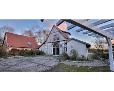 Das Haupthaus ist ca. 207 m² groß und beinhaltet einen separaten Eingang, eine helle Deele zum Wohnen, eine große Wohnküche, zwei Bäder und 4 Schlafzimmer, einen Hobbyraum, Kellerräume, zwei Terrassen und einen großzügigen Wintergarten. Das Fachwerkhaus könnte selbst bewohnt oder vermietet werden, für ca. 2.095 € Kaltmiete/monatlich.
