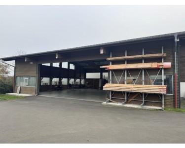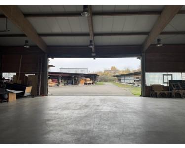 Der Bürobereich ist erhöht angeordnet und bietet einen direkten Blick über die gesamte Halle – eine Lösung, die sich in der früheren Nutzung als sehr praktisch erwiesen hat. Die angeschlossenen Sozialräume im Erdgeschoss bieten Aufenthalts- und Sanitärflächen für Mitarbeiter. Ergänzend zur Haupthalle verfügt die Immobilie über ein großes, offenes Holzlager mit rund 280 m², das flexibel für Lager- und Materialzwecke genutzt werden kann. Die weitläufigen Außenflächen sind größtenteils betoniert und bieten optimale Bedingungen für innerbetrieblichen Verkehr, Abstellflächen und Rangiermöglichkeiten.