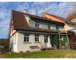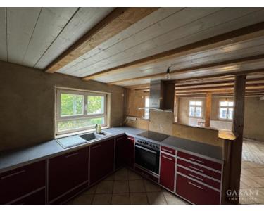 Das Haus ist in gefachter Ständerbauweise errichtet, typisch für sein Baualter, und verbindet traditionelle Elemente mit moderneren Sanierungsschritten. Im Erdgeschoss befinden sich die Küche, der Wohn-Essbereich mit einem schönen Holzofen, der gemütliche Wärme im ganzen Haus verbreitet, sowie ein Bad und ein separates Gäste-WC. Die tragenden Deckenbalken im Wohnbereich verleihen dem Raum sofort Atmosphäre. Im Dachgeschoss stehen drei Zimmer zur Verfügung, ideal als Schlaf- oder Arbeitsräume.