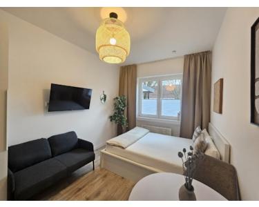 Das Apartment wurde frisch möbliert und verfügt über eine Küchenzeile mit einem 2er Ceranfeld, einer Kühl- Gefierkombi und über Unter- und Oberschränke mit einer Mikrowelle, einen Smart TV, ein 1,40 Meter breites Bett mit Staufunktion, einen Schrank im Flur und 2 Kleiderschränke im Wohn-Schlafbereich. In dem größeren Kleiderschrank befindet sich